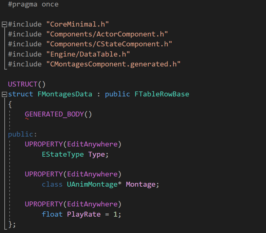 열에는 상태값인 EStateType과, 몽타주객체인 UAnimMontage, 애니메이션의 실행속도를 나타낼 PlayRate 변수를 선언하였고, 이들을 담고있는 FMontagesData라는 구조체를 만들었다.