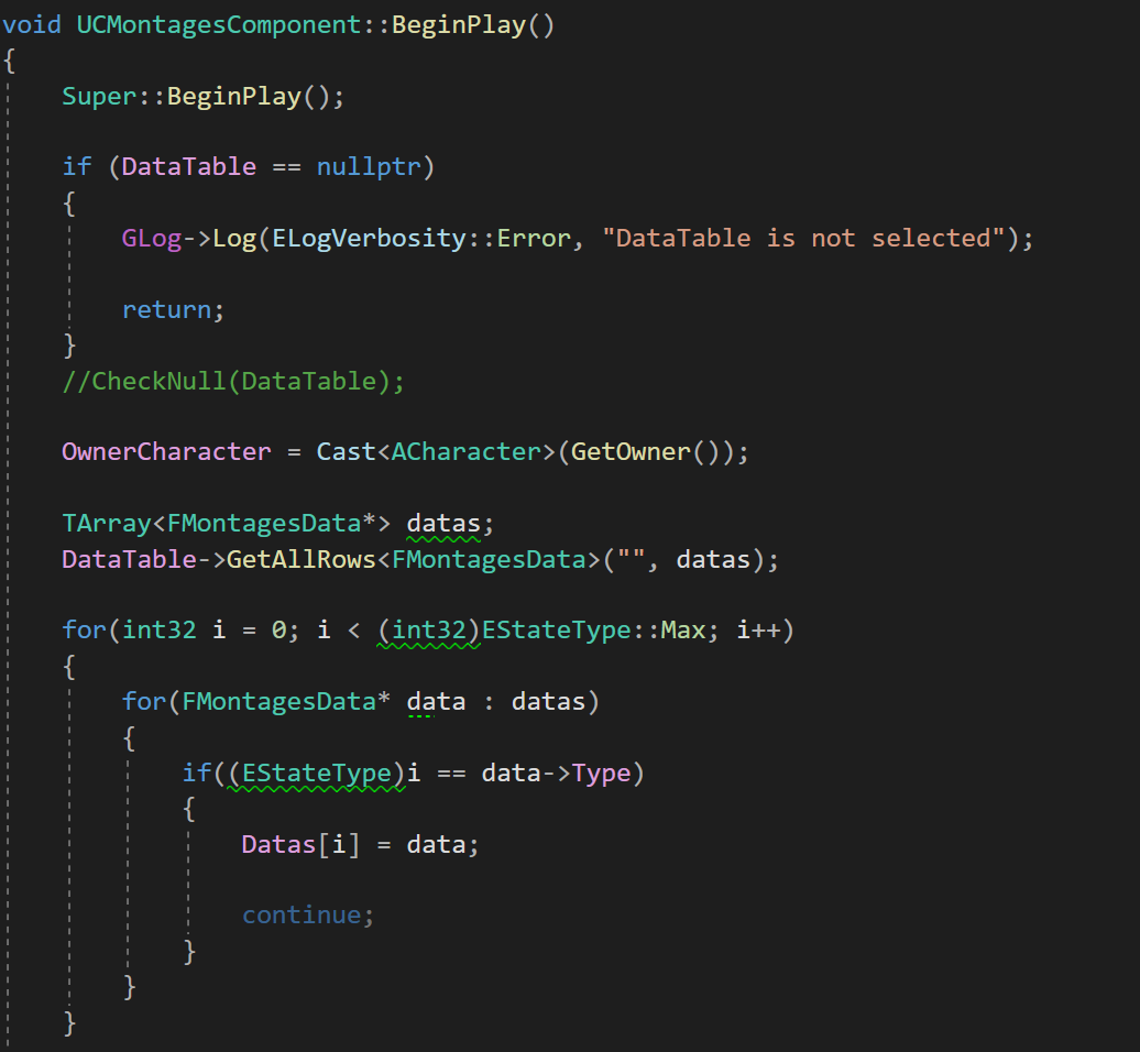 클래스 안에는 csv파일을 읽어 정보를 저장할 UDataTable 객체와, 읽은 정보들을 토대로 FMontageData 구조체로 내용을 담을 Datas 배열을 선언하였다.