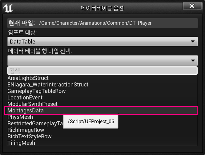 이때 데이터 테이블의 옵션으로 Cpp 클래스로 만들었던 MontagesData를 선택해준다.