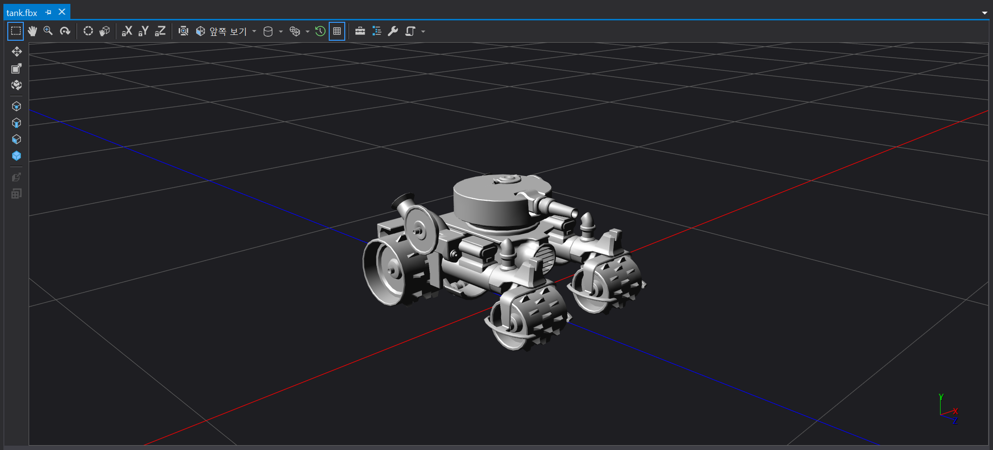 위와 같은 tank.fbx 파일을 읽은 후 .mesh 파일로 저장해보았다.
