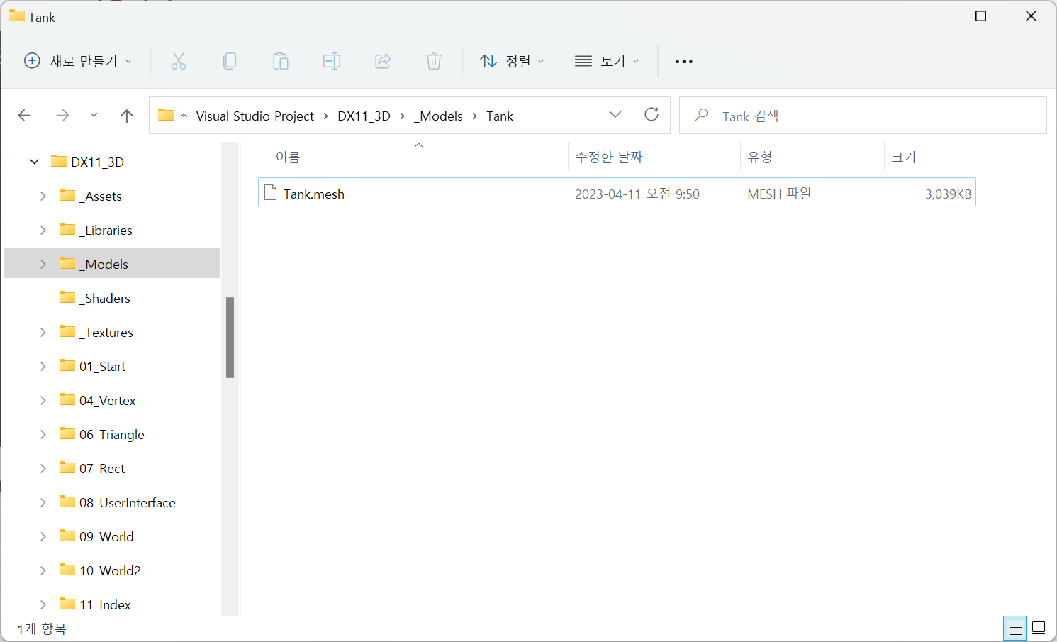 프로그램 실행 결과, 지정해두었던 path인 "_Models/Tank"에 Tank.mesh 파일이 생긴것을 확인할 수 있었다.