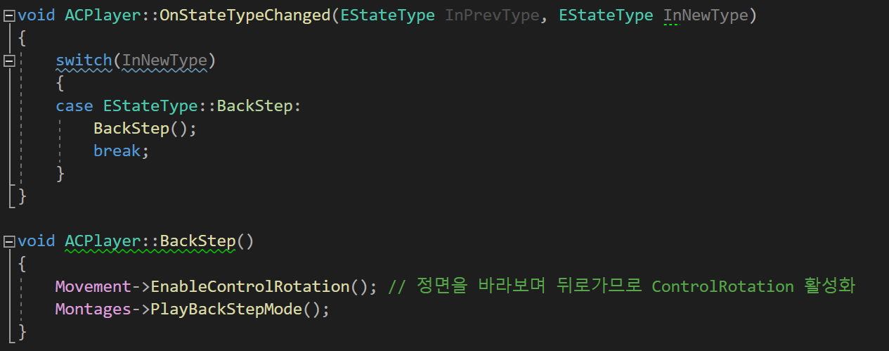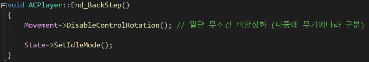 모든 조건에 충족한다면 StateComponent의 SetBackStepMode 함수를 호출하여 플레이어의 State값을 BackStep으로 변경한다.