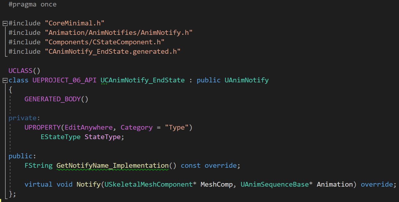 UAnimNotify를 상속받는 AnimNotify_EndState 클래스를 생성하였고, StateComponent 헤더파일을 추가하여 EStateType을 사용할 수 있도록 하였다.