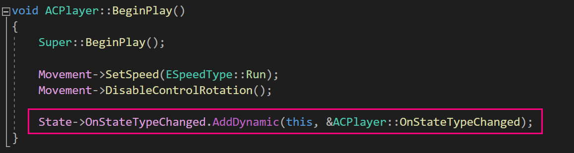OnStateTypeChanged 함수를 CPlayer 클래스에서 정의하여 델리게이트에 AddDynamic으로 등록해두었다.