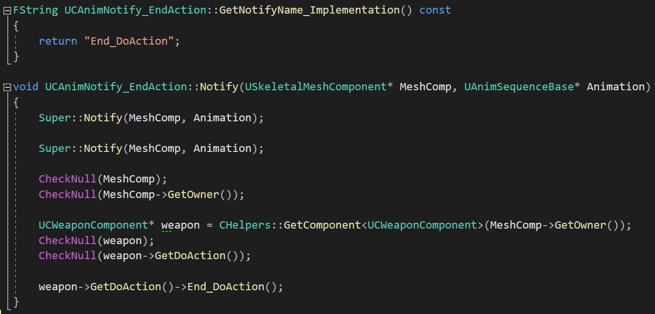 DoAction 함수와 Begin_DoAction, End_DoAction 함수는 무기마다 다를 수 있기 때문에 재정의 할 수 있도록 virtual로 선언하였다.