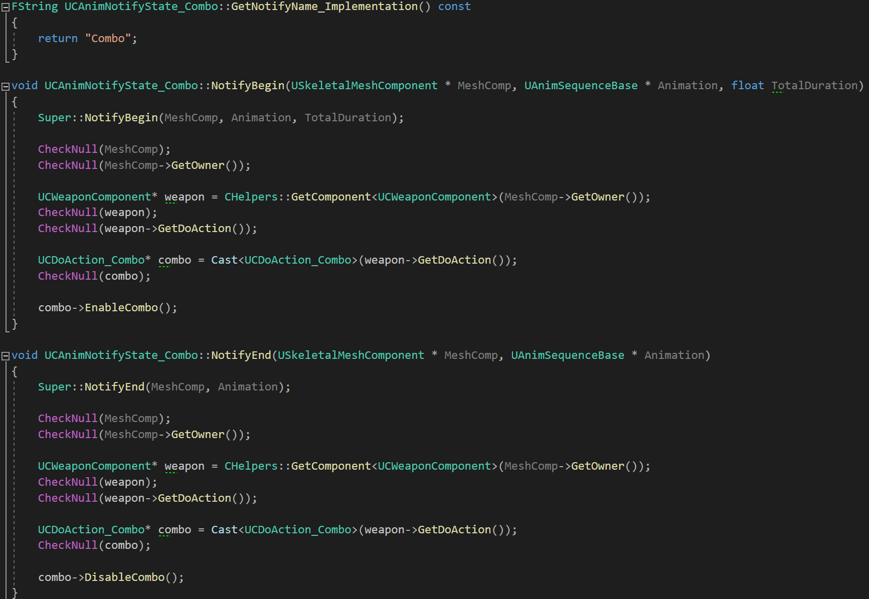 NotifyBegin이 시작되면 DoAction_Combo 클래스의 EnableCombo 함수를 호출하여 콤보를 입력받을 수 있도록하고, NotifyEnd가 시작되면 DisableCombo로 콤보입력을 종료하였다.
