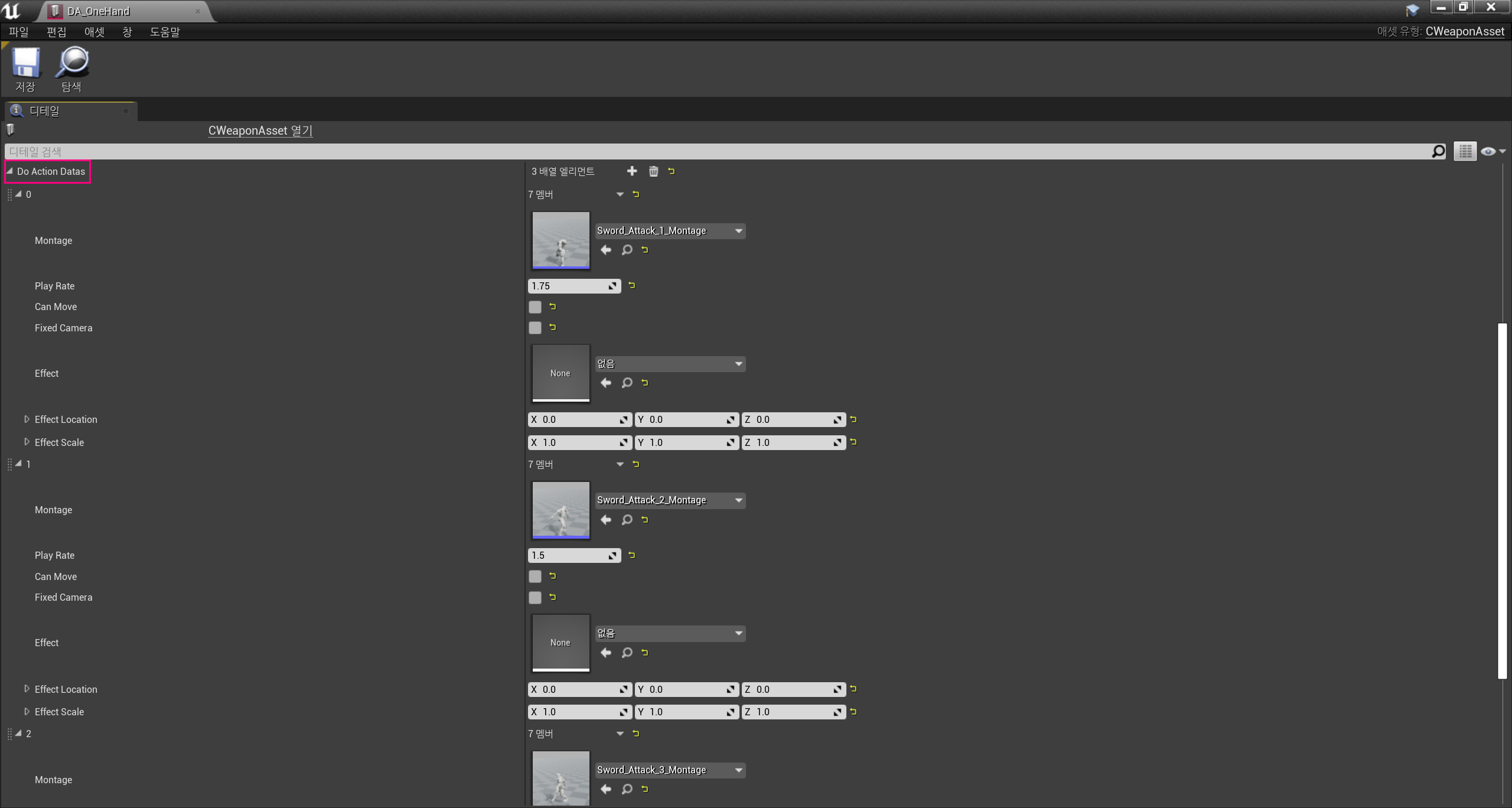 무기인 Attachment를 Sword로 설정하였기 때문에 Sword 를 사용하여 공격하는 Do Action Data 세 개를 DataAsset_OneHand 클래스에 추가하였다.