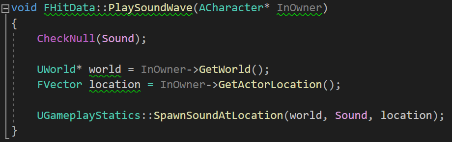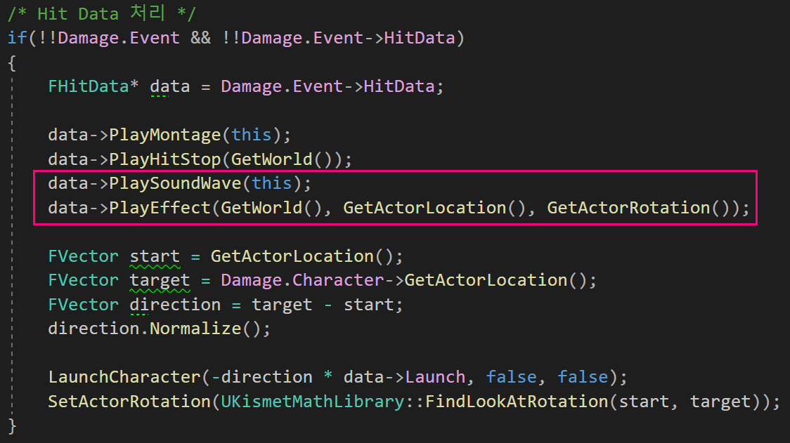 CHelpers 클래스에서 이펙트를 간단히 출력시킬 수 있는 PlayEffect 함수를 모두 작성하였다면, 이제 HitData에서 Effect가 존재할 때 데미지를 입은 캐릭터에 Effect를 출력할 수 있는 PlayEffect 함수를 작성하였다.
