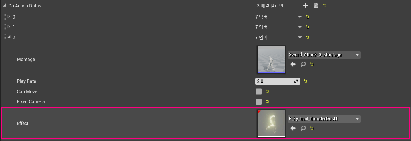마무리로 DA_OneHand 데이터애셋에 마지막 공격에 이펙트를 출력하도록 이펙트 객체를 추가해주었다.