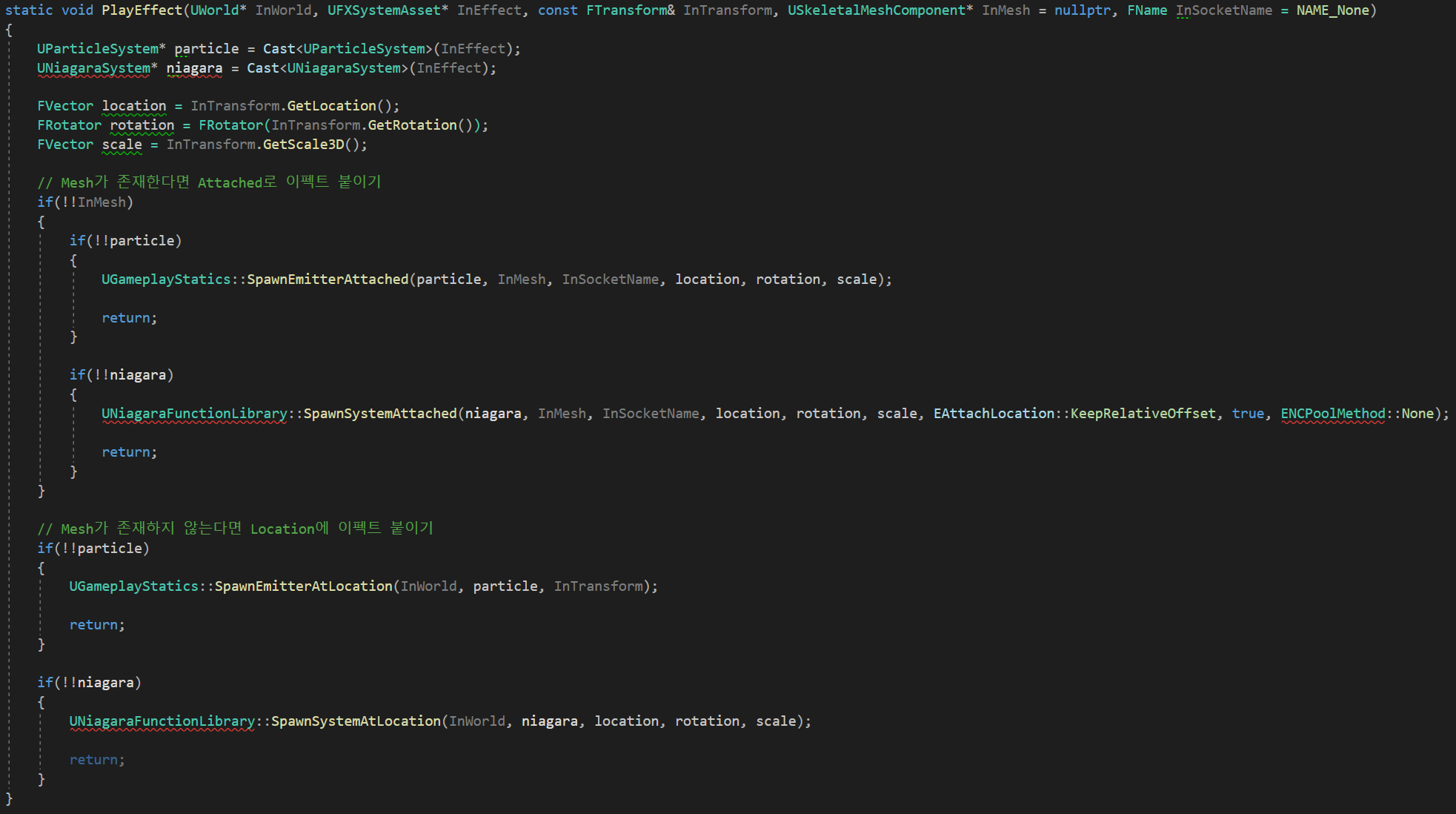 InEffect 객체를 UParticleSystem과 UNiagaraSystem으로 각각 형변환시켜 저장한 뒤, 형변환 한 객체가 NULL이 아니라면 해당 자료형으로 된 이펙트이기 때문에 이펙트별로 알맞는 Spawn 함수를 호출시켜주었다.