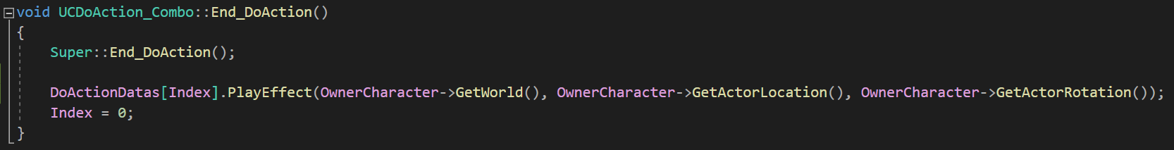 이후, DoAction_Combo 클래스의 End_DoAction 함수에서 이펙트를 출력하도록 함수 호출하여 공격이 끝날쯤 이펙트가 나오도록 하였다.