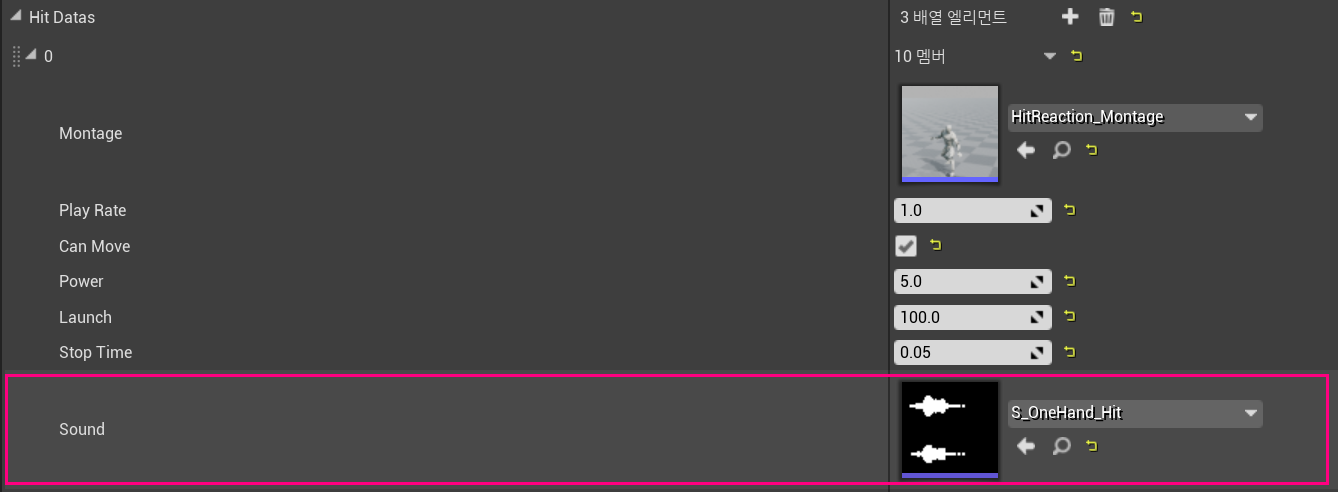 이후, DataAsset 객체인 DA_OneHand에 생성되어있는 Sound 속성에 출력하고자하는 오디오 파일을 넣어주었다.