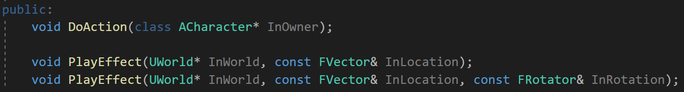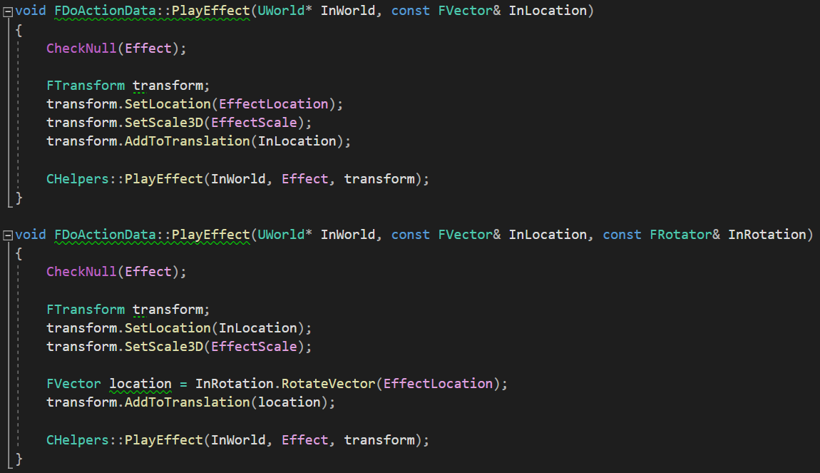 PlayEffect 함수는 회전을 매개변수로 받는 함수와 받지않는 함수 두가지로 만들어주었고, 회전 값을 받으면 RotateVector 함수를 통해 위치값으로 방향을 보정해서 돌려주었다.