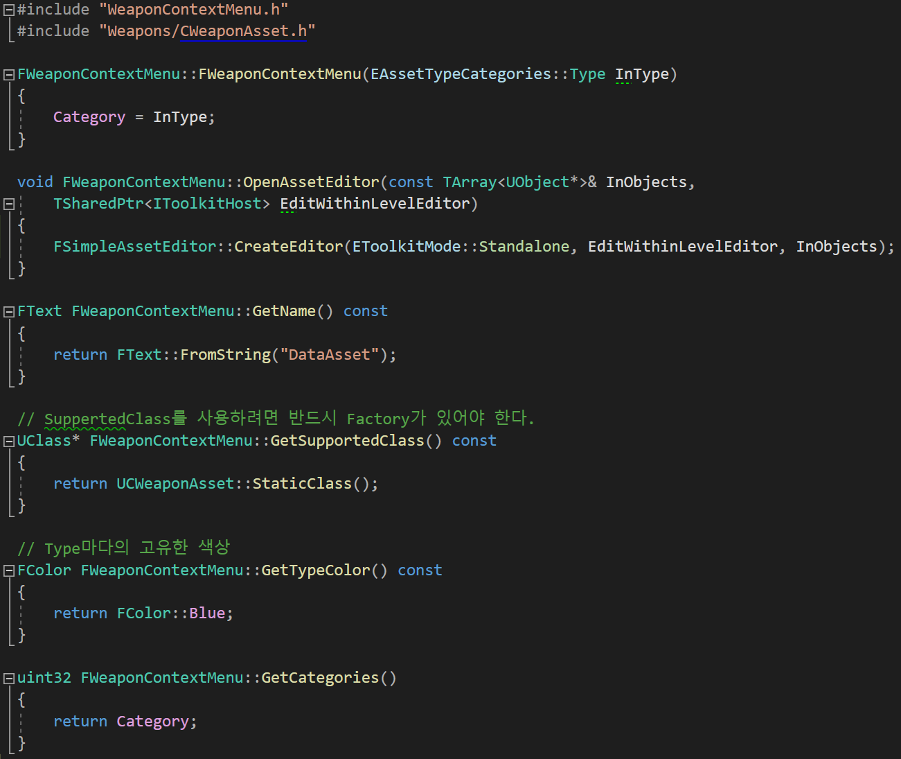 상속받은 FAssetTypeAction_Base 클래스는 또한 IAssetTypeAction 인터페이스를 상속받고, 인터페이스에 존재하는 순수가상함수들(GetName, GetSupportedClass, GetTypeColor, GetCategories)을 오버라이드해주었다.