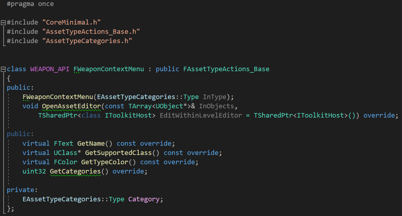 FAssetTypeAction_Base를 상속받는 WeaponContextMenu 클래스를 생성하였다.