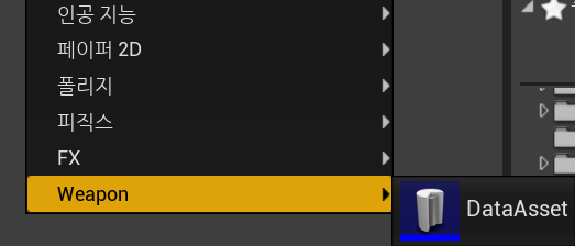 컴파일 후 프로그램을 실행시키면 마우스 오른쪽 버튼을 눌렀을 때 Weapon이라는 카테고리가 생성되고, 카테고리 목록에 DataAsset이라는 속성이 추가되어있는 것을 확인할 수 있었다.