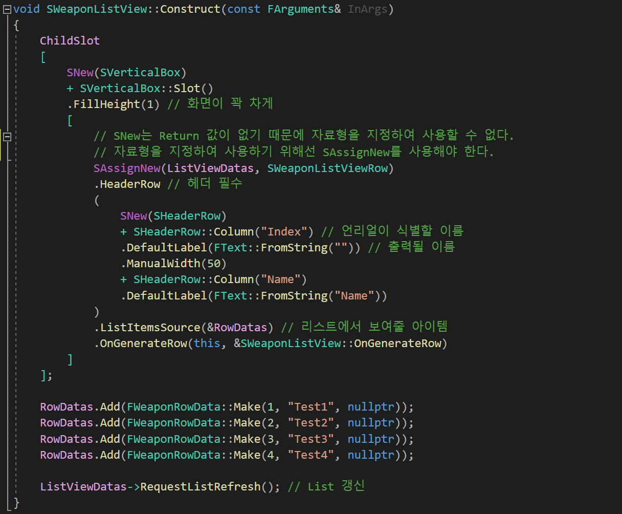 SVerticalBox의 Slot 내용으로 ListView 데이터를 추가하였는데, 이때 데이터를 매개변수로 받아야 하기 때문에 SNew가 아닌 SAssignNew 함수를 사용하였다.