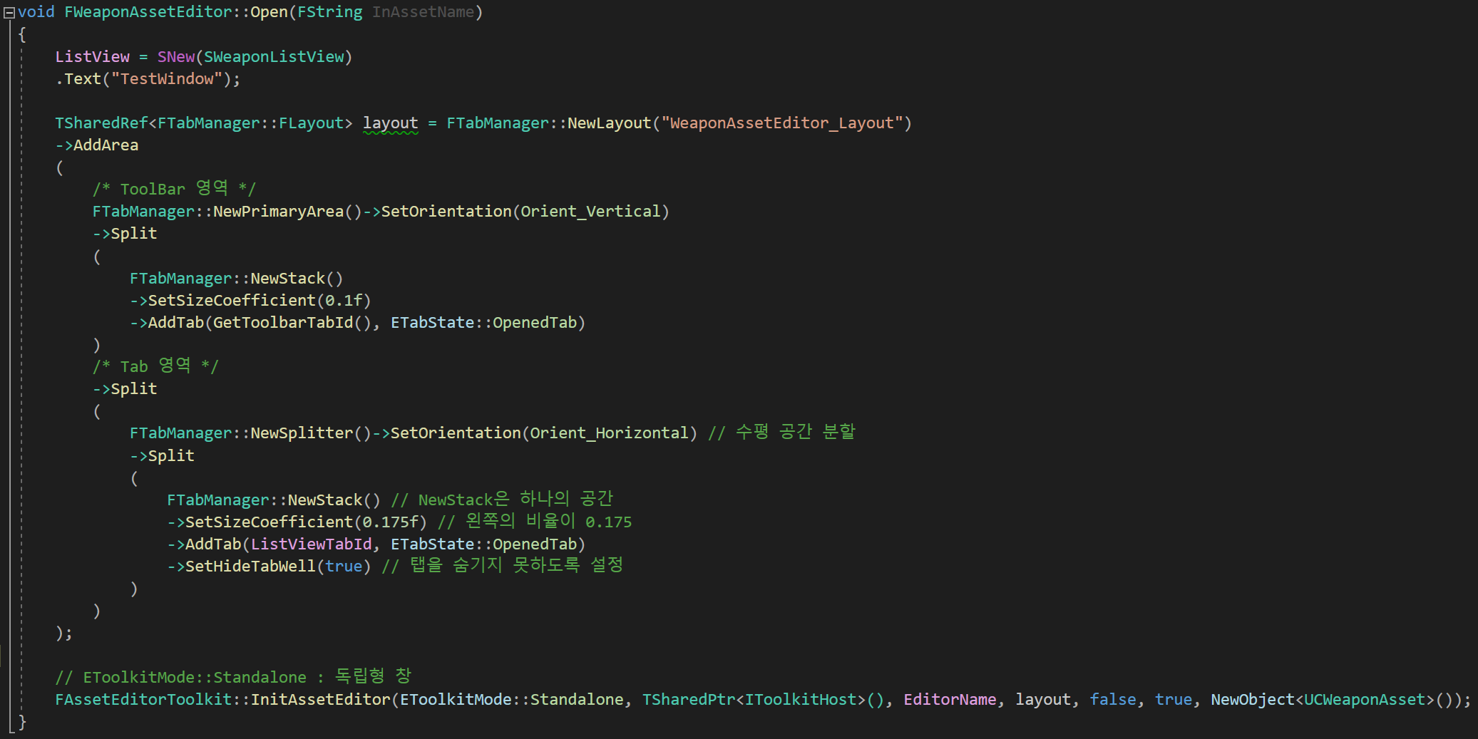 애셋 에디터의 기본 레이아웃은 FTabManager의 inner 클래스인 FLayout을 사용해 제작한다.
