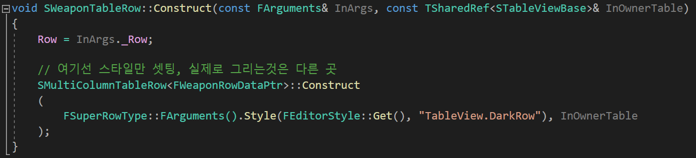 SCompoundWidget을 상속받는 WeaponListView와 마찬가지로, SWeaponTableRow 클래스도 Construct 함수를 선언해야 한다.