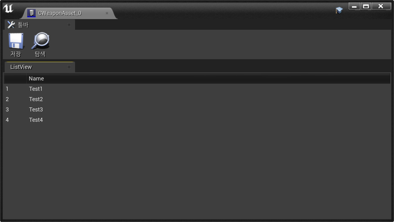 툴바에 Weapon이라는 커스텀 버튼을 추가하여 Command 입력이 들어오면 Weapon Asset Editor 창의 열리도록 구현하였다.