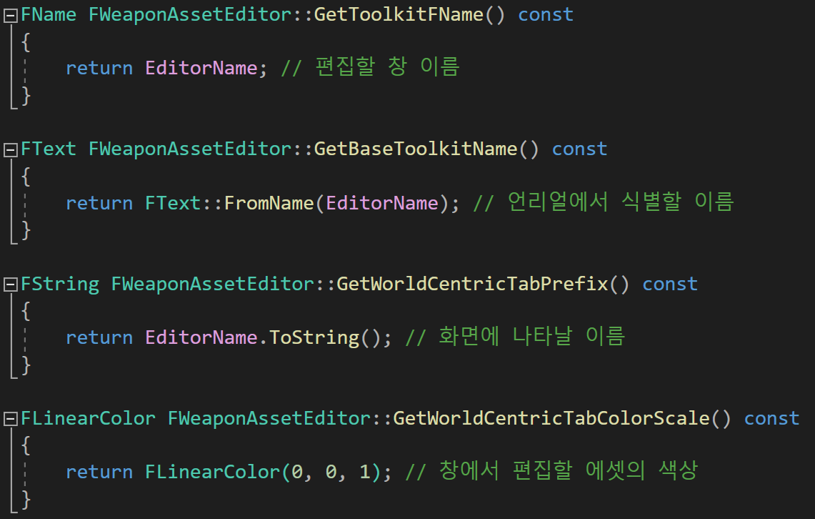 먼저, FAssetEditorToolkit 클래스의 순수가상함수를 재정의하였다.