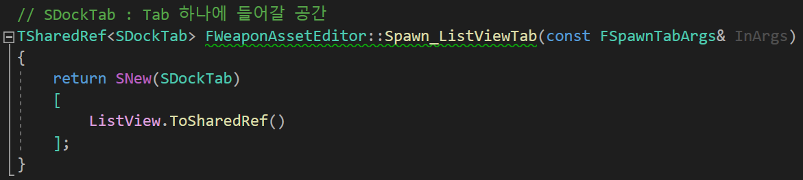 Spawn_ListViewTab 함수는 SNew로 SDockTab의 공간을 생성하고, ListView를 Tab 공간에 추가하여 반환해준다.