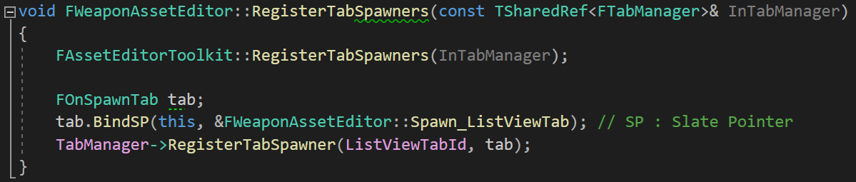 FOnSpawnTab 객체로 Tab 객체를 만들고, TabManager의 RegisterTabSpawner 함수를 통해 현재 에디터에서 사용하는 탭을 등록해주었다.