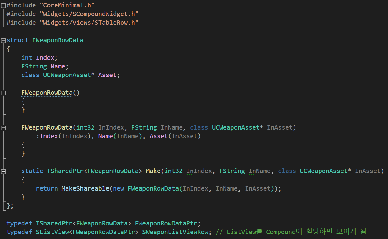 이 구조체를 TSharedPtr 포인터로 다루기 위해 typedef로 이름을 FWeaponRowDataPtr로 지정해두었다.