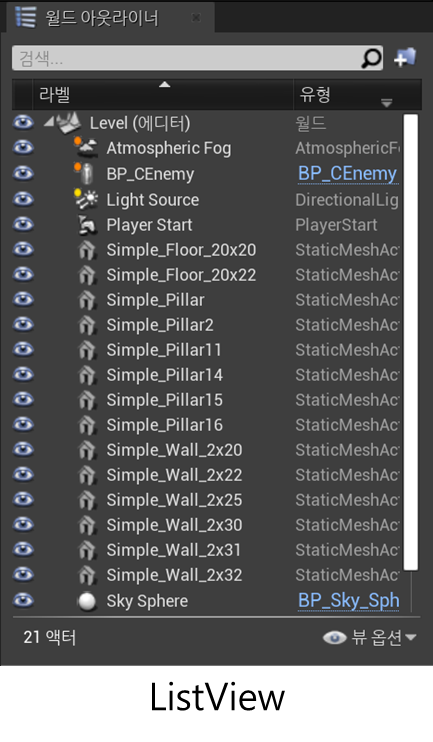 월드 아웃라이너처럼 객체같은 목록들을 쭉 보여주는 ListView 형태를 제작해보았다.