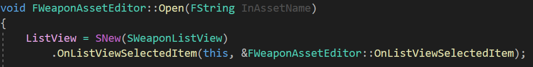 WeaponAssetEditor의 화면이 열릴 때 ListView의 OnListViewSelectedItem 델리게이트에 WeaponAssetEditor 함수를 등록시켜주었다.