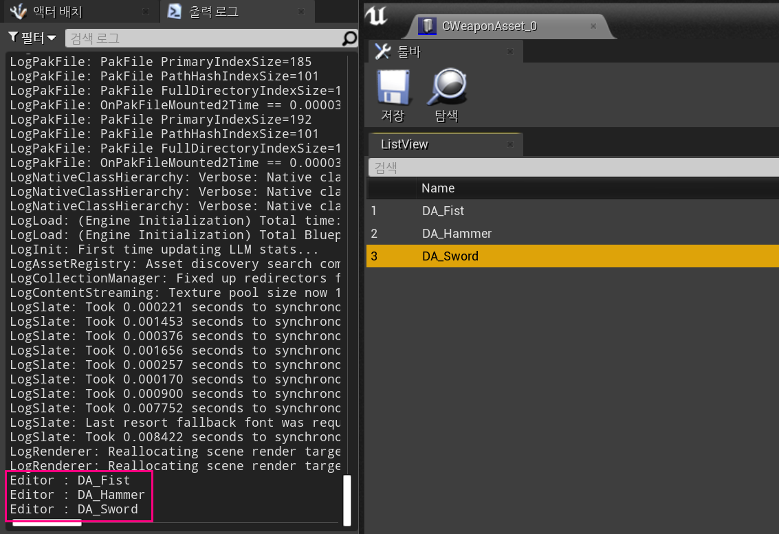 컴파일 후 WeaponAssetEditor 창을 열어보면 읽어온 DataAsset들이 ListView에 추가되어 나타나있고,
