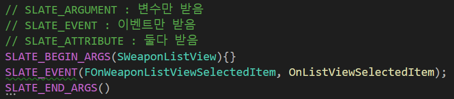 헤더파일에서는 SLATE_EVENT 명령어를 통해 OnListViewSelectedItem 함수를 받을 수 있도록 설정하였다.