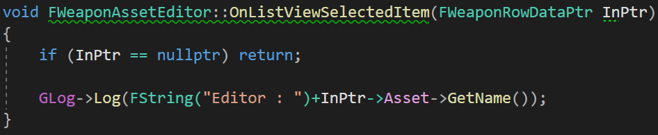 WeaponAssetEditor 클래스에서도 OnListViewSelectedItem 함수를 생성하여, WeaponListView에서 전달해주는 FWeaponRowDataPtr을 출력해보았다.