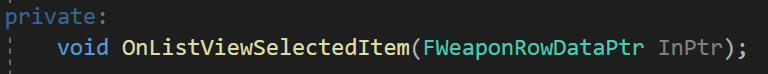 OnSelectionChanged 함수에서는 선택된 항목이 InPtr 매개변수로 들어오고, 해당 FWeaponRowDataPtr을 OnListViewSelectedItem 이벤트로 Execute 시켜주었다.