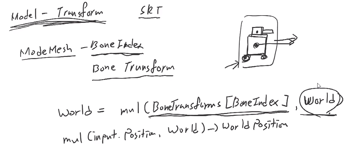 Model의 Mesh마다 BoneIndex가 존재할 때, BoneIndex를 참조해서 Bone에 있는 Transform을 그리게 된다.