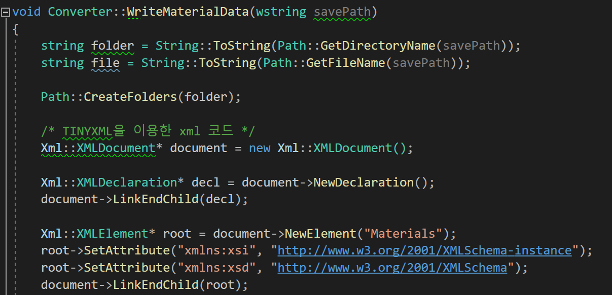 여기서는 TINYXML 라이브러리를 이용한 xml 코드를 작성하였는데, TINYXML는 C++로 xml 코드를 작성할 수 있도록 만들어진 라이브러리로, 헤더파일로 제공되기 때문에 손쉽게 프로젝트에 추가하여 사용할 수 있다.