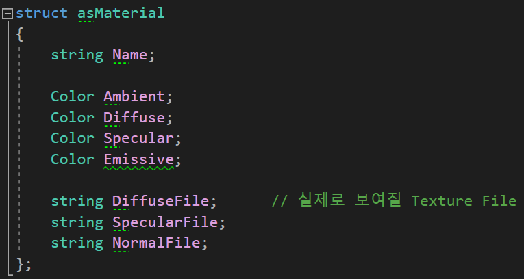 Material의 정보를 저장하기 위한 구조체로, Material의 색상값들과 각 Material File의 경로를 저장하기 위한 변수를 담아두었다.