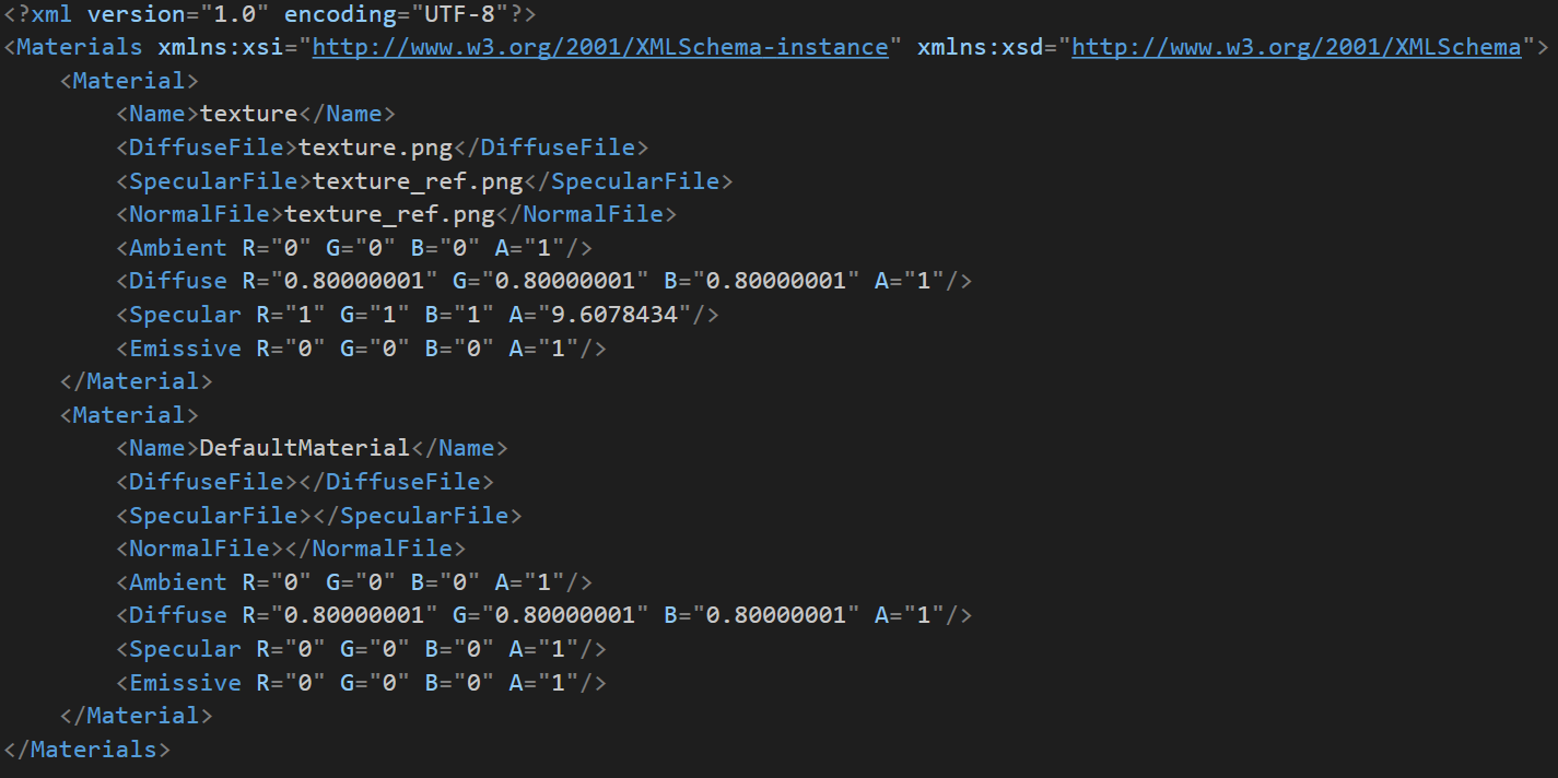 WriteMaterialData 함수에서는 이러한 xml 코드를 이용하여 Material의 Name, DiffuseFile, SpecularFile, NormalFile을 저장하고, Ambient, Diffuse, Specular, Emissive의 Material Color 값들을 저장하였다.