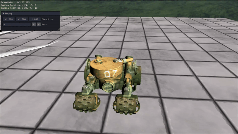 ModelDemo 클래스의 Update 함수에서 탱크 객체의 포탑부분이 빙글빙글 돌아가도록 회전시켜보았다.