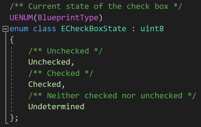 IsChecked 명령어의 매개변수에는 ECheckBoxState 열거형 타입이 들어가는데, 해당 열거형을 살펴보면 체크해제가 0, 체크가 1 이므로 true, false로 사용해도 무방하다.