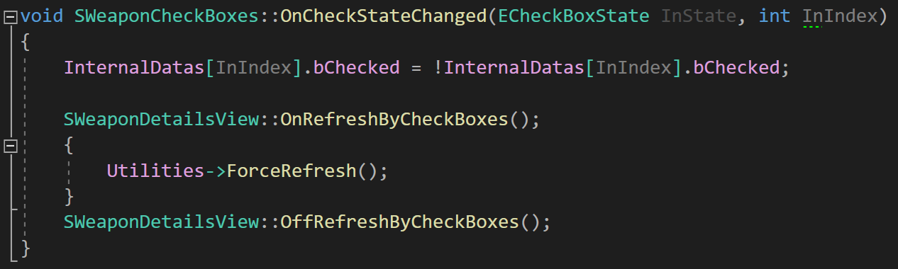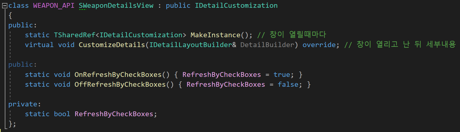 이러한 RefreshByCheckBoxes 값을 조정하기 위한 함수와 변수를 SWeaponDetailsView 클래스에 추가하였다.