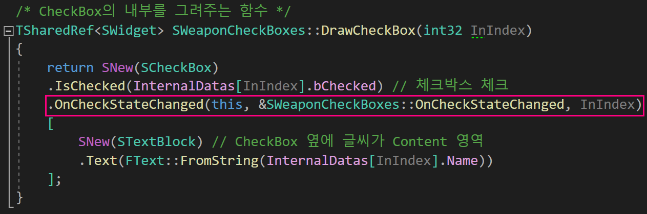 OnCheckStateChanged 델리게이트에 등록한 OnCheckStateChanged 함수는 CheckBoxState를 매개변수로 받고, 변환된 체크박스가 누구의 체크박스인지 판별하기 위해 별도의 매개변수 InIndex를 추가해주었다.