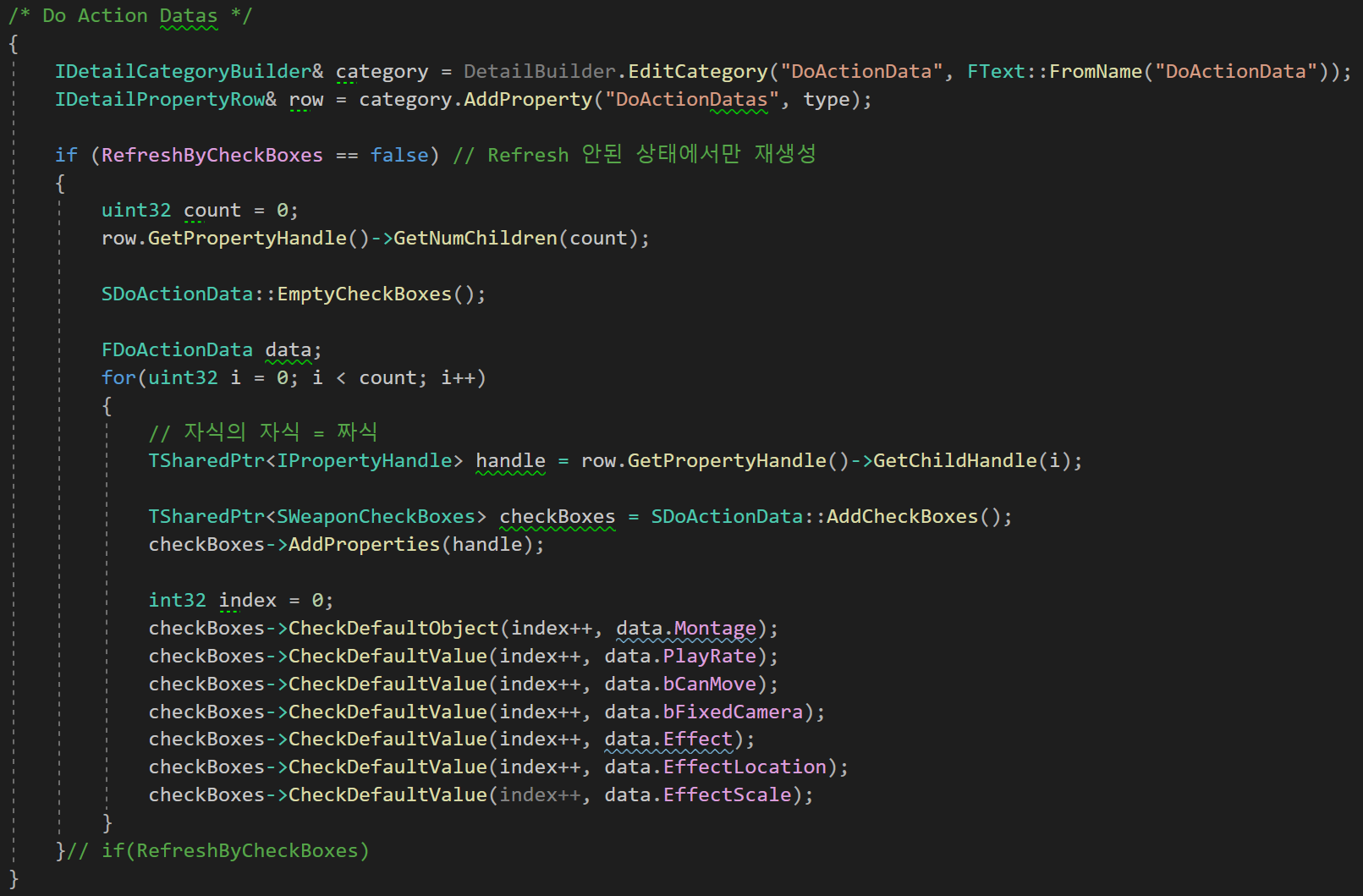 두 클래스 모두 EquipmentData와 마찬가지로 속성 값을 커스터마이징하는것이기 때문에 IPropertyTypeCustomization을 상속받았고 두 클래스간의 소스코드는 거의 동일하므로 아래부터는 Do Action Data를 나타내는 방법에 대해서만 설명하였다.
