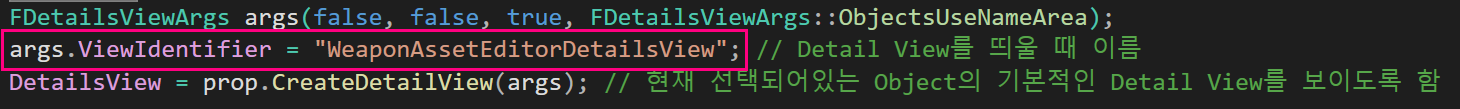 DetailsView를 생성할 때 Details View의 Arguments를 "WeaponAssetEditorDetailsView"로 설정해두었기 때문에, FPropertyEditorModule 객체를 이용하여 FindDetailView 함수로 해당 디테일 뷰를 가져왔다.