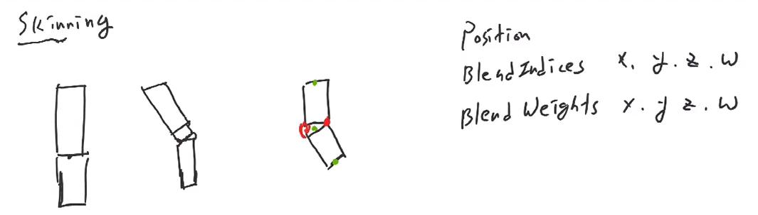 본의 각 정점은 위치(Position)와 본의 번호 BlendIndices(x,y,z,w)와, 본의 가중치 BlendWeights(x,y,z,w) 값을 갖는다.