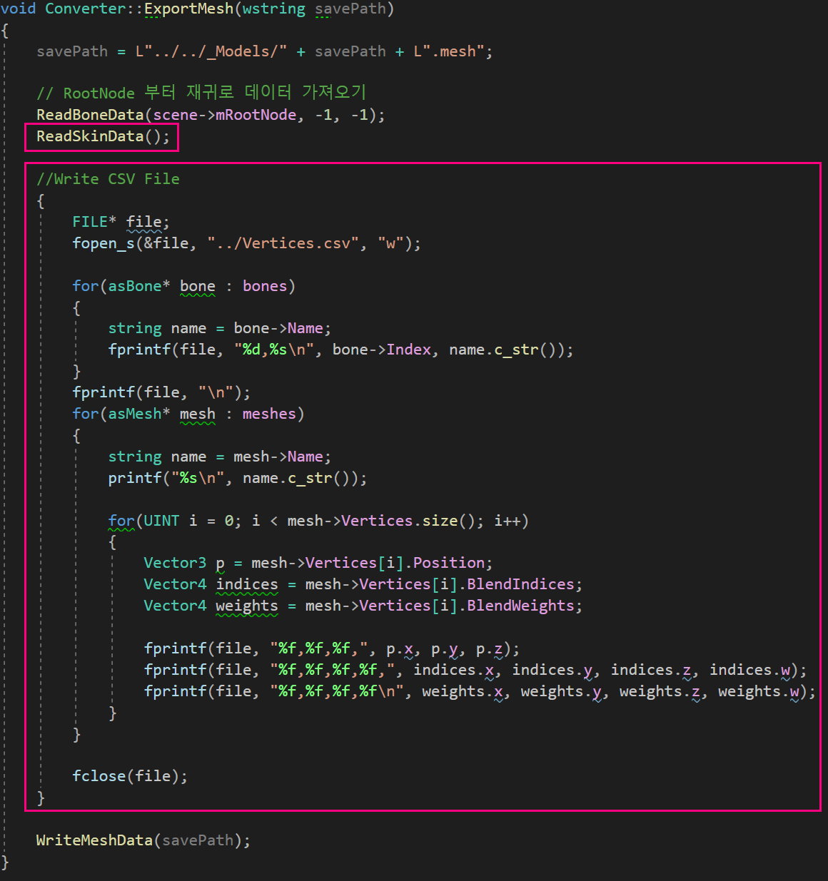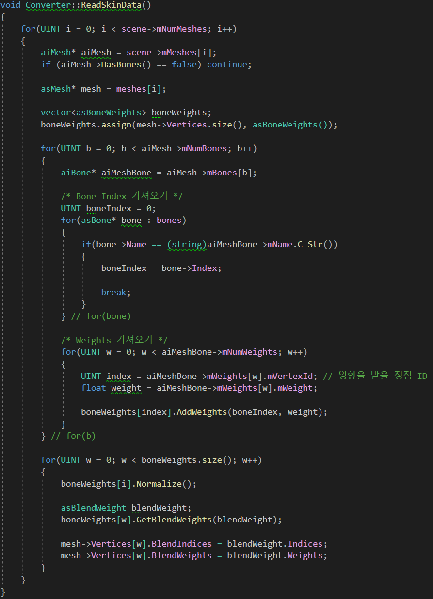 이후에는 Converter 클래스에서 일어온 Mesh들에 존재하는 각 Bone들의 정보를 불러오고, 순서대로 각 본의 Index를 불러온 뒤, Bone이 가지고있는 Weights의 개수만큼 weight값도 불러왔다.