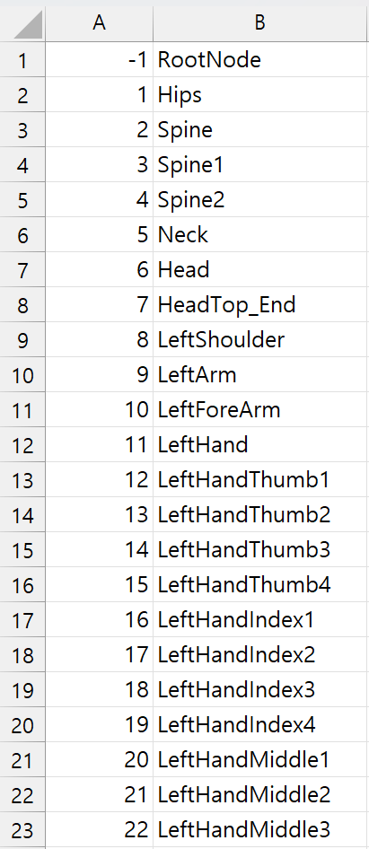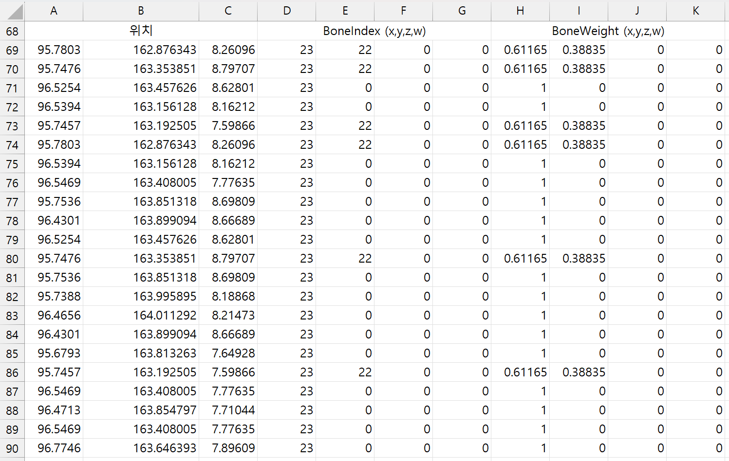 최종적으로, 읽어들인 SkinData를 확인하기 위해 indices와 weights의 정보들을 csv 파일로 출력해보았다.