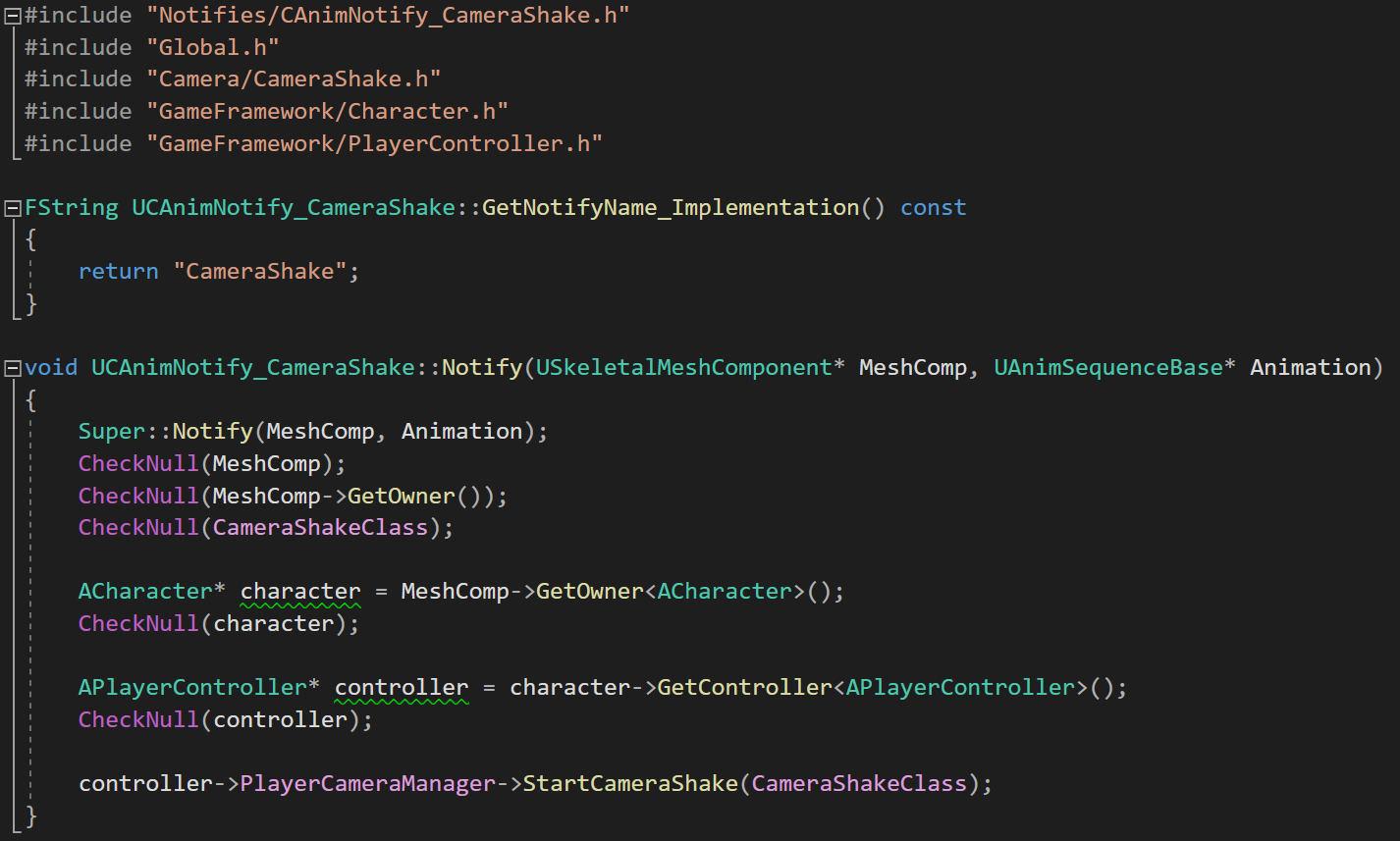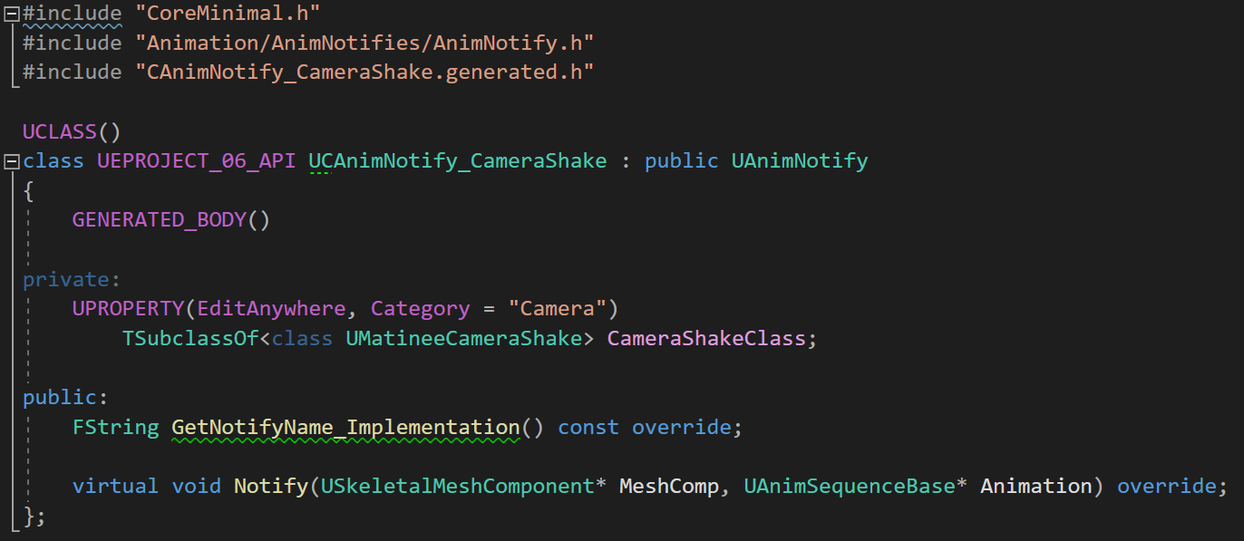 UAnimNotify를 상속받아 UMatineeCameraShake 객체를 생성해주었다.