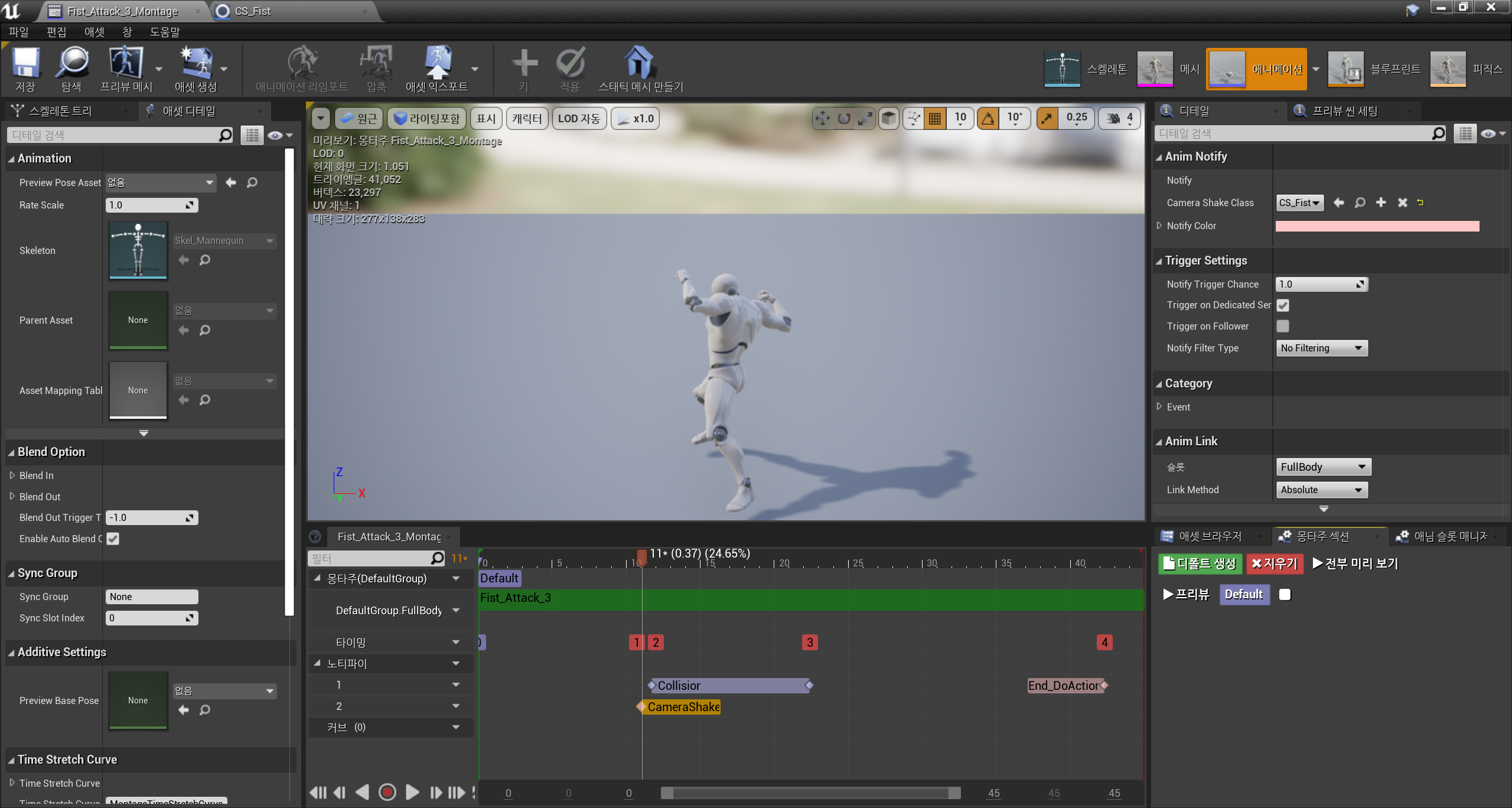 Fist의 몽타주에 Camera Shake 노티파이를 배치해주었다.