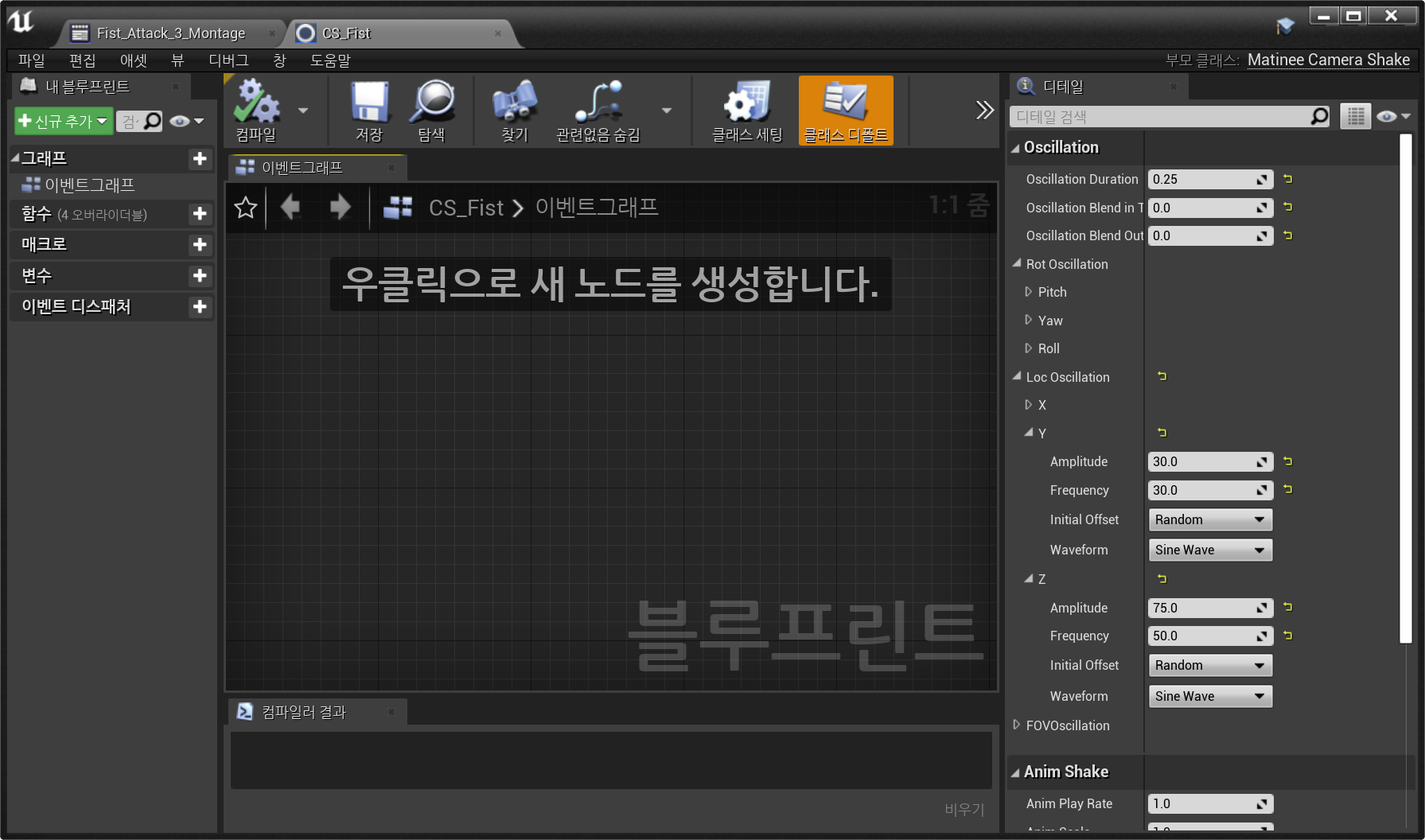 이후, Fist(맨손공격)의 마지막 공격 시 카메라 쉐이크 기능이 나타나도록 Camera Shake 객체를 만들어주었고,